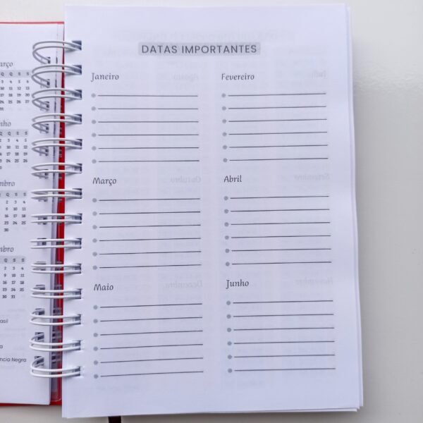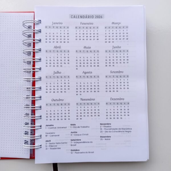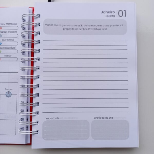 – A agenda possui página para identificação, calendário 2026/2027, datas importantes, guia de leitura da bíblia em um ano, guia de leitura livre da bíblia, divisória mensal com calendário e controle financeiro.