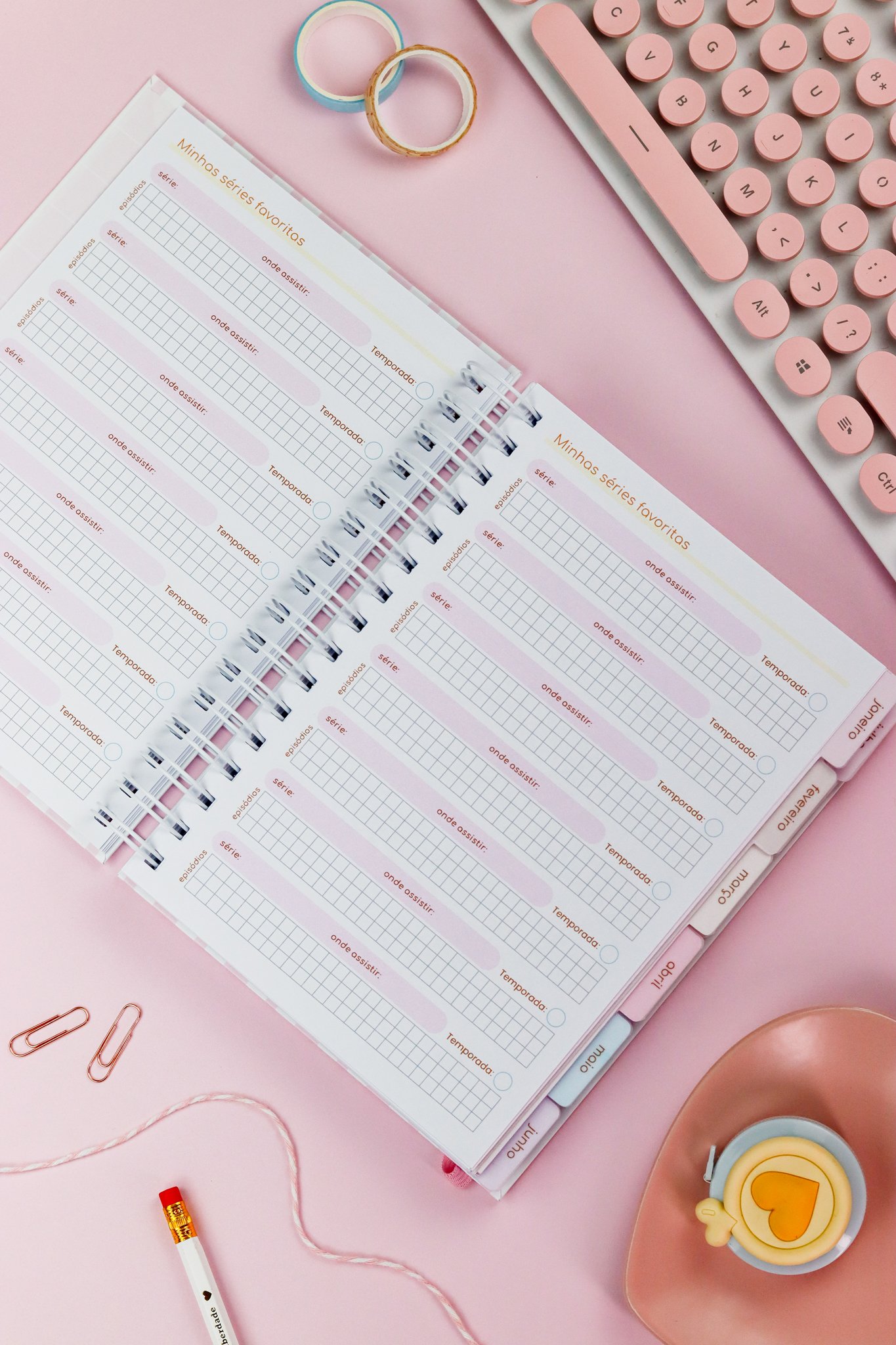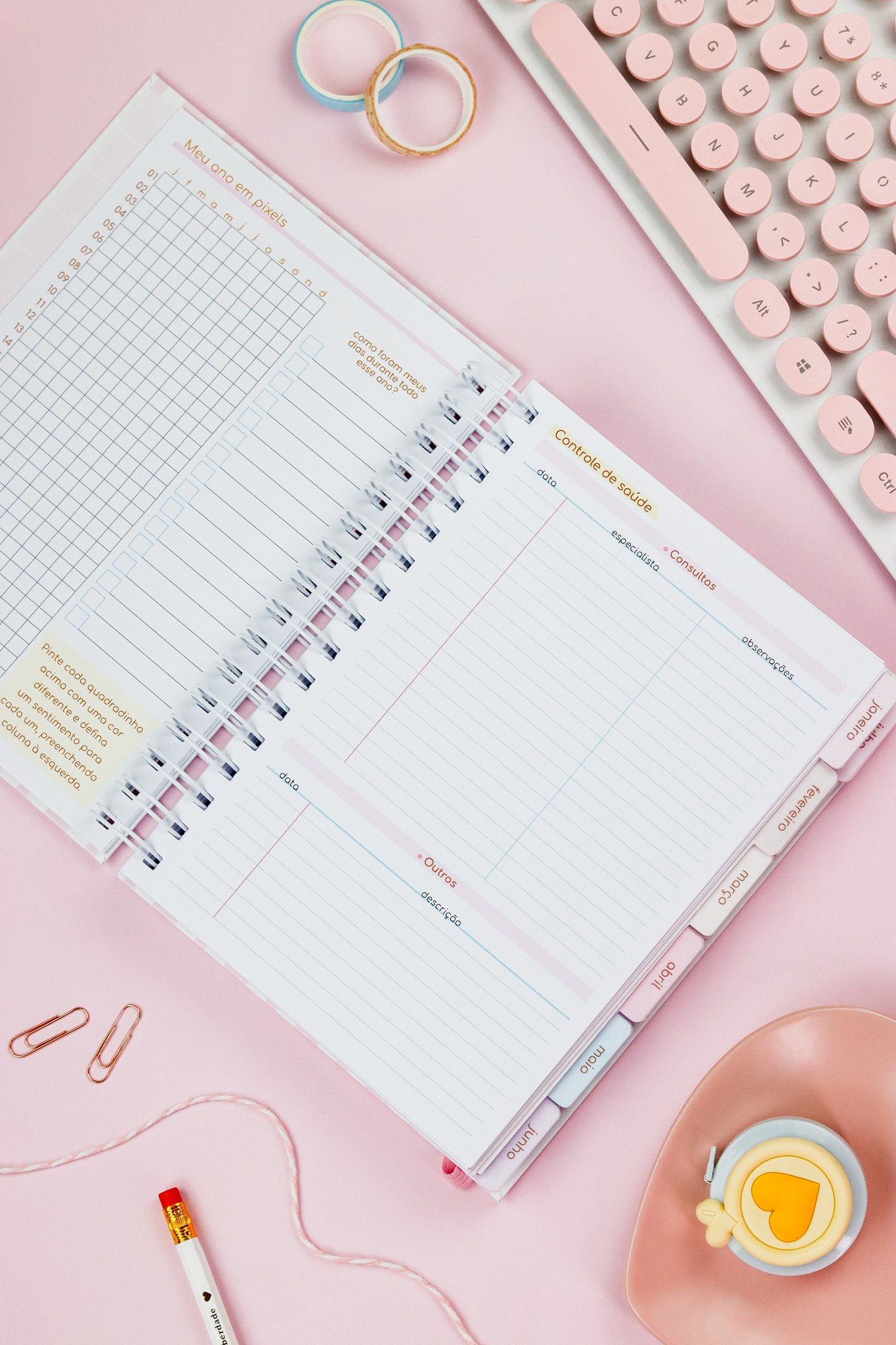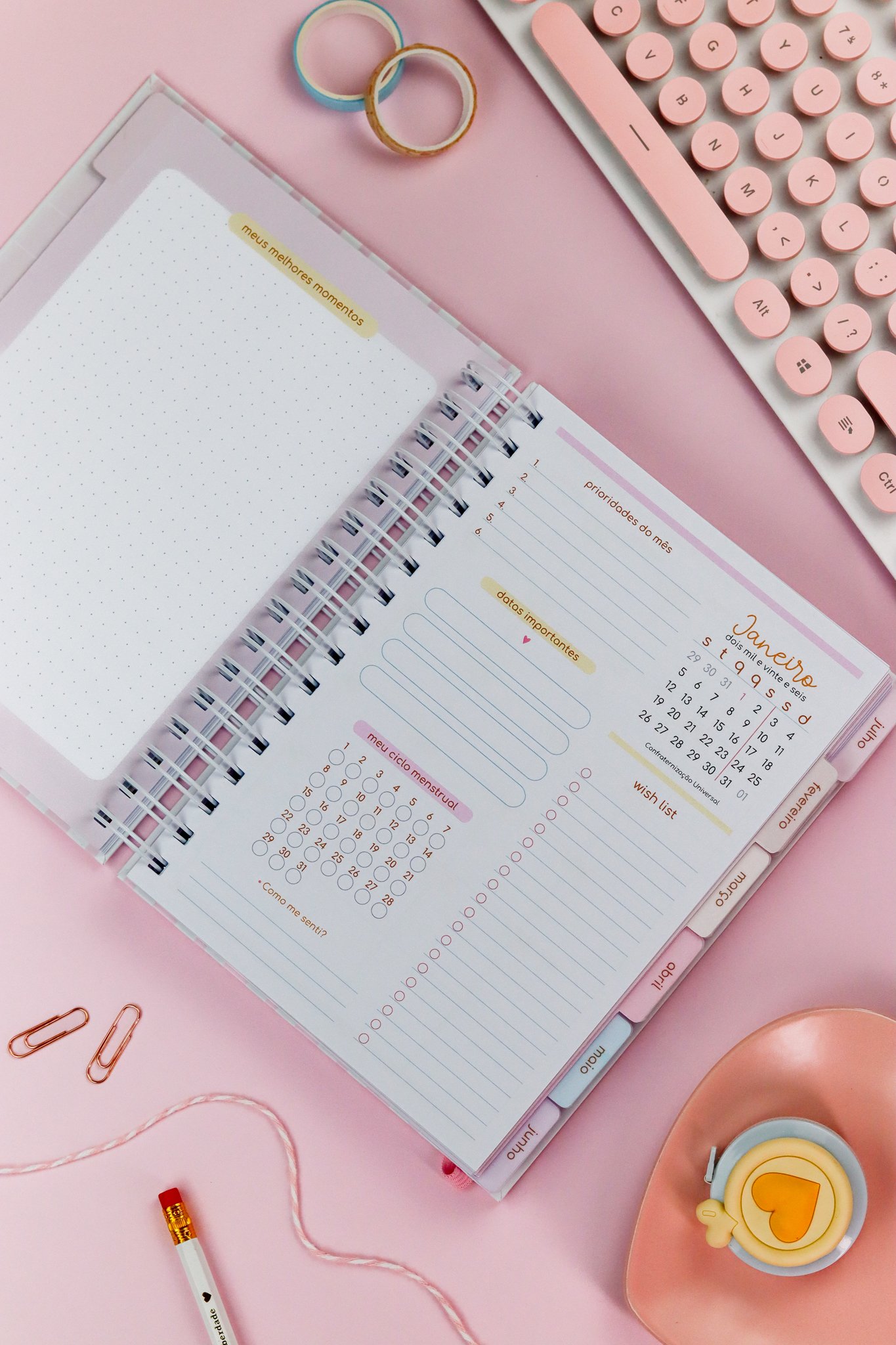 Ah, e ainda tem controle menstrual (com e sem ciclo), checklist, aniversariantes, lista de séries e livros… é aquele planner que acompanha você o ano inteiro, te ajudando a não esquecer nada e a enxergar suas metas com clareza.